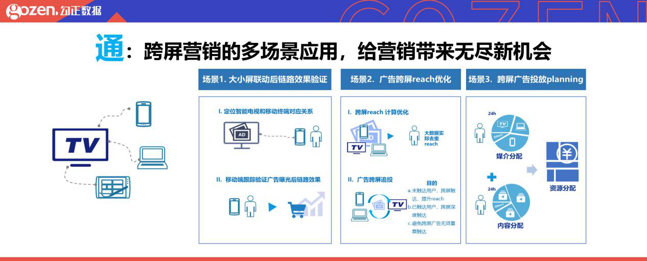 通:解决多屏营销下,如何规划投放,测量投放效果。以智慧屏为核心,进行个人关系关联,实现跨屏时间和触达的去重。解决行业难题,玩转跨屏营销。跨屏营销有更多场景,如大小屏联动的后链路效果验证,跨屏reach的优化和跨屏广告投放planning等都给营销带来无尽新机会。