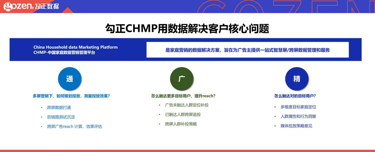CHMP 中国家庭数据营销管理平台(China Household data Marketing Platform ) 是家庭营销的数据解决方案,旨在为广告主提供一站式智慧屏/跨屏数据管理和服务。解决客户核心问题,令营销达到通、广、精。
