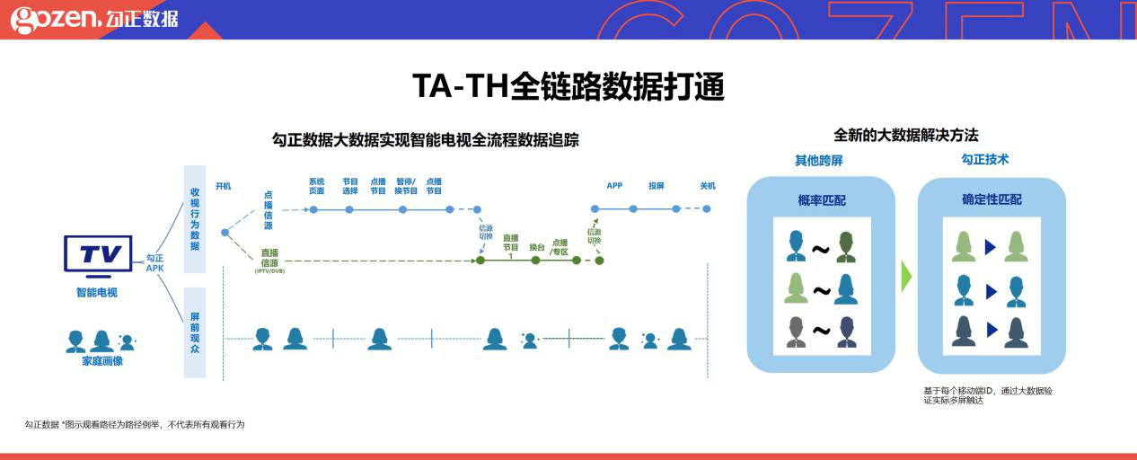 技术是第一生产力,勾正数据对智慧屏进行全链路数据采集,记录屏前用户收视行为。利用家庭物联网,突破屏间关系关联难题,实现多屏媒介资源融合。创立CHID(China Household ID)作为跨屏同源设备的唯一标识,勾正现已有家庭ID超1.23亿,个人ID超3.6亿。从而打通TA-TH全链路数据,进行跨屏的确定性匹配。