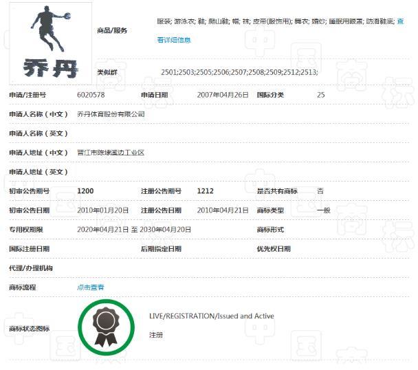 2020年3月,最高院作出(2018)最高法行再32号案判决书,乔丹体育公司第25类服装鞋帽袜等商品上的6020578号“乔丹+图形”商标被撤。