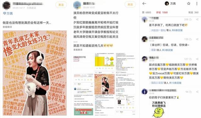 比如,得知偶像要选女团,万茜的养生粉丝“慌”了,开始努力学写控评文案,但没多久就打出了“没有祝福,自求多福”、“万茜勇敢飞,粉丝随缘追”的口号,为了凑评论,他们一句一句默写古文、解数学题,甚至报菜名……应援色则选了黄色——名曰“洋溢着一种荒唐的快乐”。