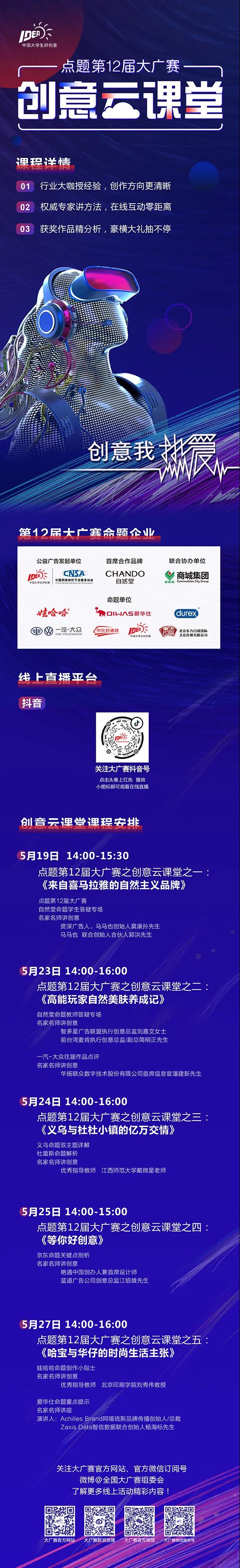 第一期大广赛命题解析课堂到这里就结束啦,后续将会在官方微博上传命题解析课堂回放,错过直播的小伙伴可以前往微博观看回放哦。接下来大广赛组委会将正式开启第二期直播——《点题第12届大广赛之创意云课堂》,以行业专家的创意拔高为主导,课程的内容包括:企业讲师互动答疑、作品创意指导以及不同类别的创作技巧。旨在更有针对性的剖析命题创作重点,帮助学生打开思路,找到创意切入点,丰富题材及表现。5月19号(周二)下午14:00,在大广赛的抖音直播间,我们将邀请自然堂命题企业讲师在线互动答疑、同时邀请著名的资深广告人、MATCH马马也文化传播创始人莫康孙先生和马马也文化传播联合创始人郭洪先生对自然堂命题进行创意点拨和指导,千万不要错过哦~