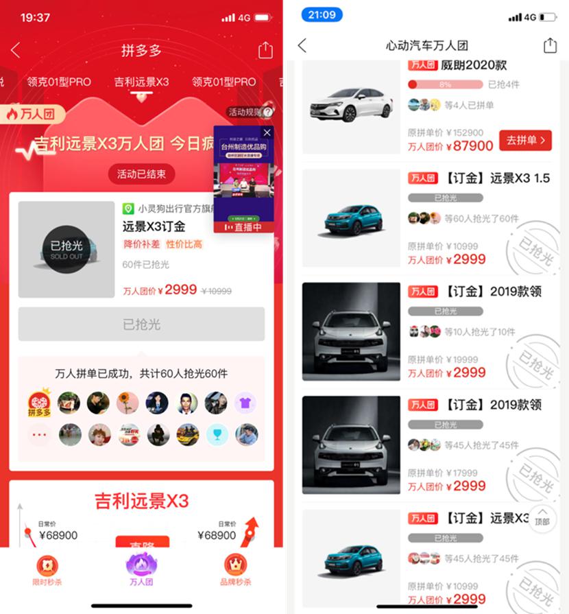 ▲拼多多页面显示,预备的50台“领克01Pro”,50台“远景X3”,连同紧急补货的60台“远景X3”一上线便被抢购一空。(图片来源:拼多多活动页面截图)