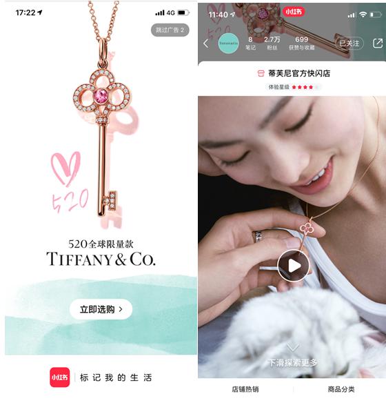 小红书与世界著名珠宝品牌Tiffany& Co. 蒂芙尼,于5月初正式开设蒂芙尼520快闪店并发布了蒂芙尼520全球限量款Keys项链,仅供线上销售,蒂芙尼成为首个尝鲜小红书闭环营销模式的奢侈品品牌。