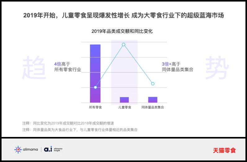 天猫数据显示,从2019年开始,儿童零食呈现爆发式增长——2019年其成交额增速是大盘增速的四倍。