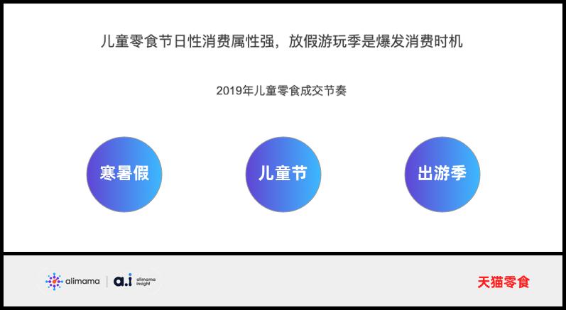 可以看到,寒暑假、国庆节等大型节假日,以及电商大型促销节日“618“、双11”、“双12”等,都集中在下半年。2019年天猫的数据显示,儿童零食的销售高峰与节假日、电商大促节点高度重合,是商家突围的好时机。