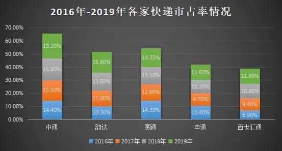 从各家公开的财报资料来看,中通在2016年首次以14.4%的份额夺得冠军之后,此后其在快递市场的份额不断提升,逐渐上升到了2019年的19.1%,渐次拉开了与韵达之间的差距;而其年份额上升速度也在加快,2017年-2019年中通的市场份额分别上升了1.1%、1.3%、2.3%,这让本就拉开的差距越拉越大,而中通行业第一的宝座愈加稳固。