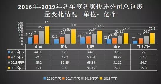从两家的包裹量来看,其差距也显而易见。2019年全年中通包裹量实现了同比42.2%的增速,总包裹量达到了121亿个,据公开披露的相关数据来看,快递总包裹量依然位居行业第一。