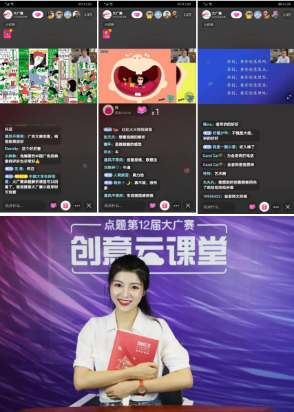 至此,点题第12届大广赛之创意云课堂圆满落幕。为期10天的六次分享课融入了媒体融合新动向、行业发展新动态、品牌命题详解析、创意分享最强音,多元整合优化了课程内容,丰富了竞赛内涵,确保了疫情特殊时期大广赛名家名师讲座内容的创新性和高阶性。希望每一位同学都能在大广赛的“磨砺”中更好地彰显创新力、专注力、凝聚力与执行力,注意知识结构的补充完善、实践技能的培养锻炼和综合素质的提升发展,调整职业生涯规划,从而更好地对接社会需求,形成竞争优势。