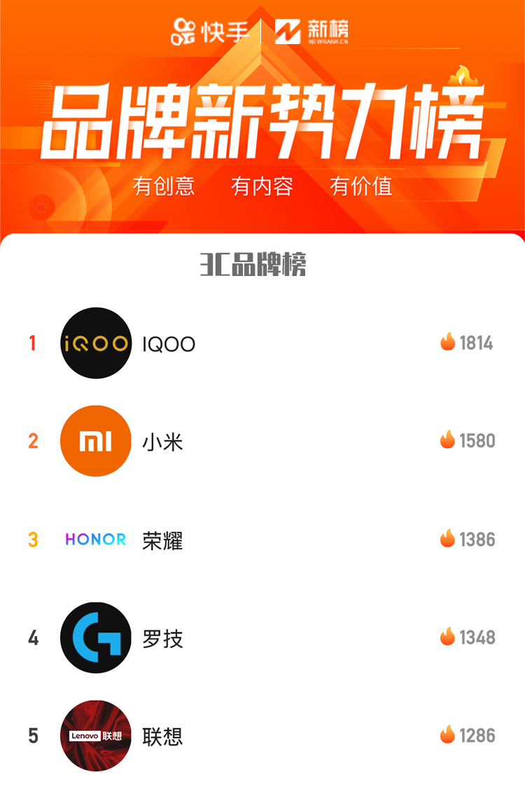3C是本月快手品牌新势力榜中新进入的行业,虽然新,但表现不俗。