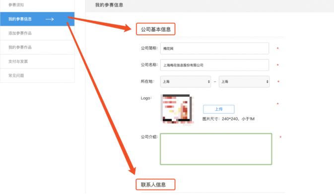 (1)完善【我的参赛信息】,根据提示录入公司基本信息和联系人信息。带*的为必填项。