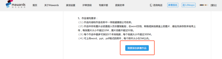 注意奖项申报的截止时间(2020年9月11日18点),注意作品填写要求,最后点击【我要添加参赛作品】,跳转添加作品。