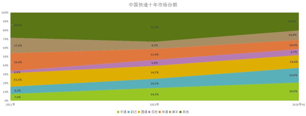 数据是最客观的证据,在2011年中通快递的市场份额仅为7.6%;但到2015年,这一数据几乎翻倍,达到14.3%;今年上半年,中通快递的市场份额更是首次超过20%。