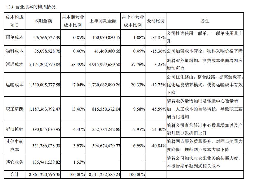具体而言,快递行业的营业成本主要由派送成本、运输成本、中转站职工薪酬等几部分组成。以申通快递2020年中报为例,派送成本在总营收成本中的占比达到58.39%,运输成本和职工薪酬则分别占比17.04%和13.4%,三项成本合计占总营收成本的88.83%。