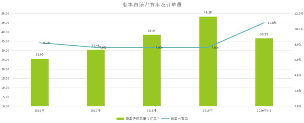 实际上,过去五年顺丰的订单量一直在不断提升,但由于整个市场的增速更快,这让顺丰的市场占有率始终维持在8%左右。直至今年上半年,疫情之下顺丰依然坚持配送,才让其逐渐扭转了市场占有率。