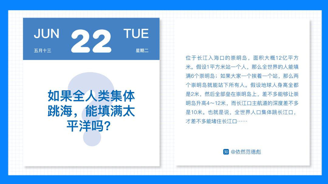 日历内容涵盖超多“知识点”。有“鱼会不会放屁?”“如果全人类集体跳海,能填满太平洋吗?”等怪诞日常与趣味脑洞,也收录了“氧气如此重要,为什么人呼吸时不完全吸收它,还要呼出去一部分?”等硬核科普,及“如果科比知道自己的结局,还会那么努力吗?”等情绪疗愈回答。小小的一本日历,包含着知乎所有“大智慧”和“小聪明”。