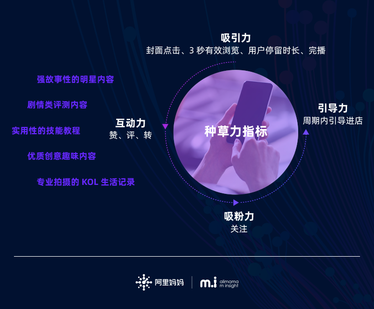 超级短视频内容打造关注吸引力、互动力、吸粉力和引导力四个种草指标。短视频内容方向上建议:强故事性的明星内容,剧情类评测,实用技能教程,趣味创意,专业拍摄的KOL生活记录,高效获取曝光并提升转评赞互动。洞察发现,有剧情演绎、意外反转的短视频内容能够提升有效播放,开箱体验、视觉趣味创意和展示商品特色能够有效引导进店。