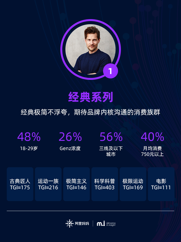 洞察发现,经典系列热销对下沉市场仍具有很强的渗透力,集中在18-29岁年轻人,崇尚极简不浮夸的生活,追求知识和内在精神沟通,偏好运动、电影和科普内容。针对这群人打造服饰系列时要注重穿搭和场合,偏好基础简约风,或者轻奢商务风。品牌在甄选代言和KOL联名合作时,这群人倾向时尚名媛和大咖设计师,看重知名度和影响力,比如刘雯、藤原浩、三宅一生。站外媒体资讯、知识问答内容种草,站内品牌私域和聚划算做流量收割,同时,重视促销节点和会场打造。