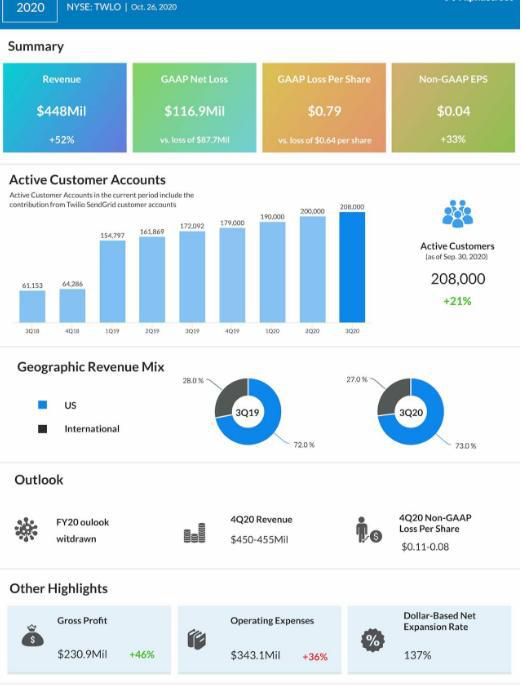美股研究社获悉,Twilio周一盘后公布了2020年第三季度的财报。