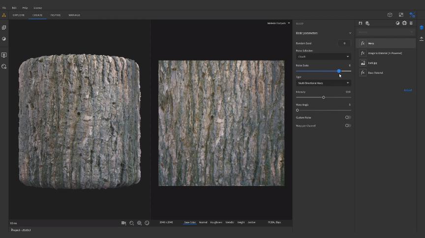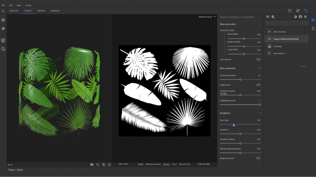 在扫描流程工具箱中,Substance Alchemis的材质库更新了利用AI滤镜将图像转换为材质的功能。这个由Adobe人工智能平台Adobe Sensei支持的滤镜可帮助用户充分利用摄影素材数据,将其转变为可用的材质。新版的材质库对这一功能的参数进行了重置,提升了AI滤镜的表现,如粗糙度的生成。例如,在处理树叶时,用户可以轻松地赋予它你所需要的柔和度。此外,用户还可以调整或者降低材质的光泽度。