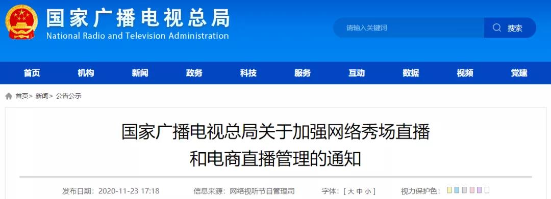 近年来,网络秀场直播、电商直播节目大量涌现,成为互联网经济中非常活跃的现象和网络视听节目建设管理工作需要重视的问题。11月23日,广电总局官网发布《国家广播电视总局关于加强网络秀场直播和电商直播管理的通知》(广电发〔2020〕78号)(以下简称《通知》),以加强对网络秀场直播和电商直播的引导规范,强化导向和价值引领,营造行业健康生态,防范遏制低俗庸俗媚俗等不良风气滋生蔓延。