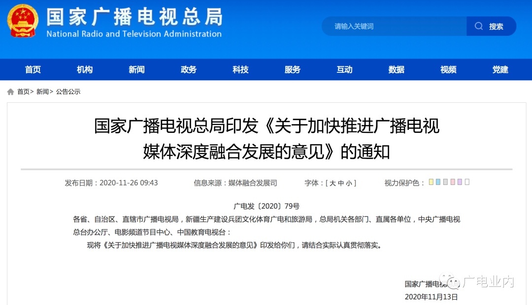 11月26日,广电总局印发《关于加快推进广播电视媒体深度融合发展的意见》的通知。