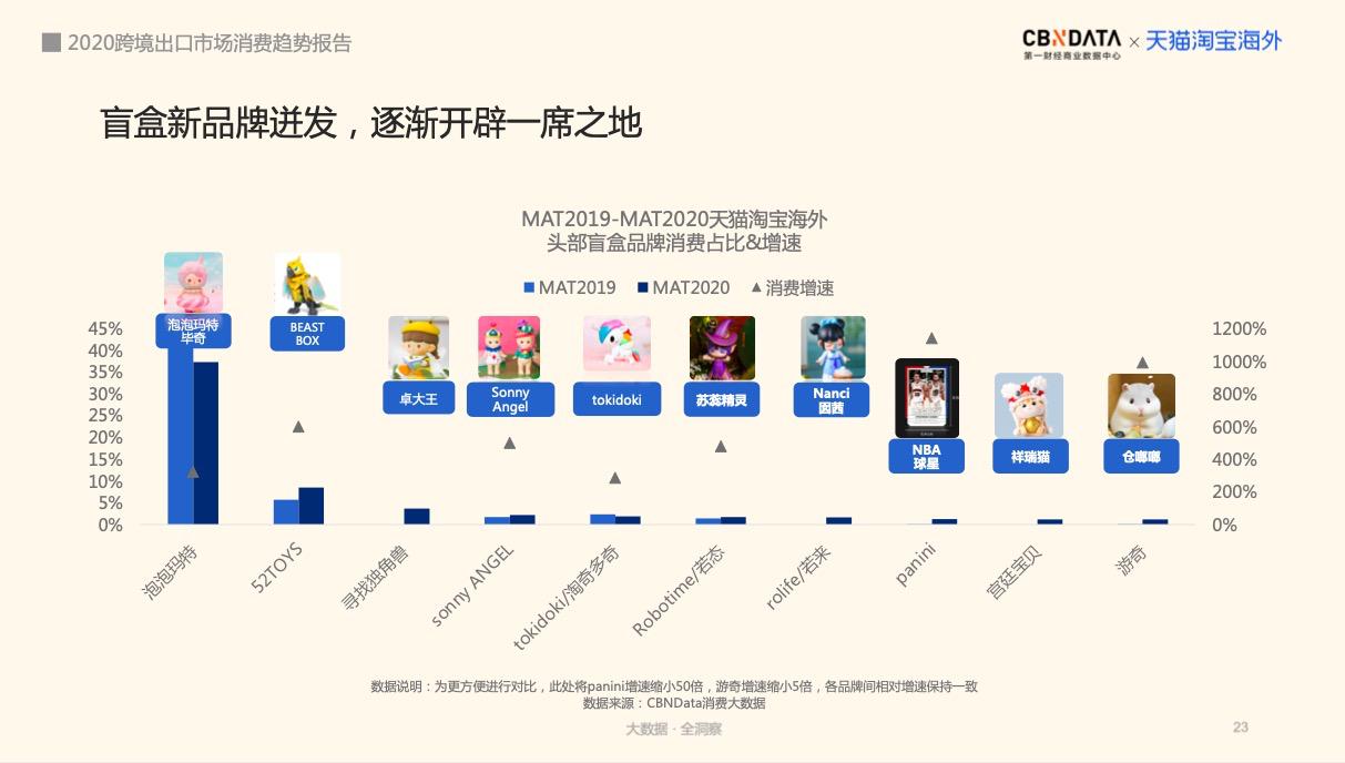 报告显示,“盲盒第一股”泡泡玛特、52TOYS、寻找独角兽、十二栋等新兴潮玩手办品牌,通过天猫、淘宝平台在海外走红,出口至美国、澳大利亚、加拿大、新加坡、韩国等120多个国家和地区。