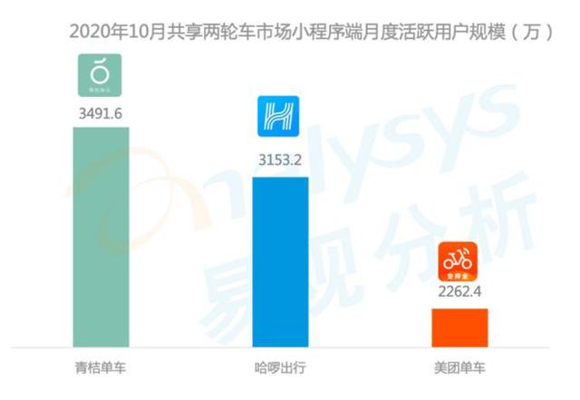 根据易观发布的《2020中国共享两轮车市场专题报告》指出,目前的共享单车市场上青桔单车以3491万活跃用户排名第一,哈啰出行以3153万排在第二,美团单车(摩拜单车)排在第三,但活跃用户的数量却有一定的差距,为2264万。