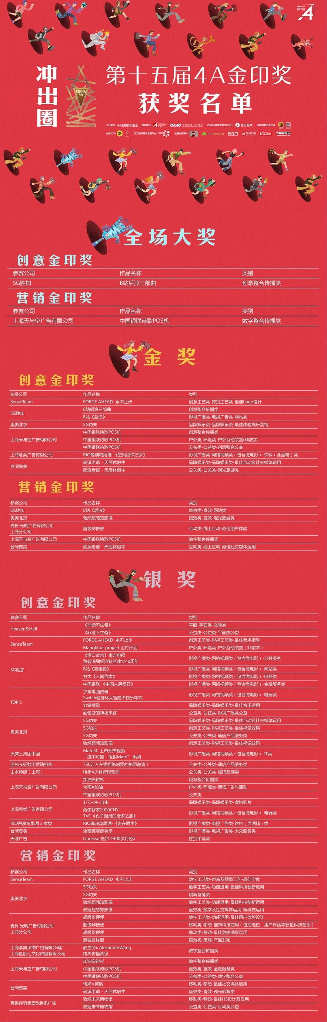 2020中国·4A金印奖终审花絮最终评选出的4A金印奖、银奖、金奖依次颁布,还有全场创意大奖、全场营销大奖,一个个优质又极具创意的作品经过所有评审的精挑细选一一揭晓,在现场与直播间观众的共同见证下隆重颁布。更有金印奖点评展映和幕后分享,让人们在现场再次感受获奖作品的魅力。获奖团队将带我们走进作品幕后的故事,独家分享刷屏案例背后的创作灵感与填坑心得。最后本次颁奖典礼还为4A金印奖年度代理商TOP3进行了颁奖,这也是中国•4A首次评选此奖项!获奖公司分别是:奥美集团、天与空、SG胜加。