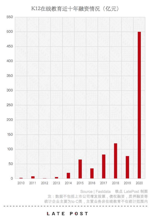 这已经是作业帮今年拿到的第二笔融资,加上这一笔,中国 K-12 在线教育行业 2020 年融资额超过 500 亿元——超过这个行业此前十年融资总和。数亿美元的融资消息几乎每个月都有,腾讯、阿里、百度、字节跳动等互联网大公司,和软银、老虎基金、DST Global 等一众国际大基金均入场。