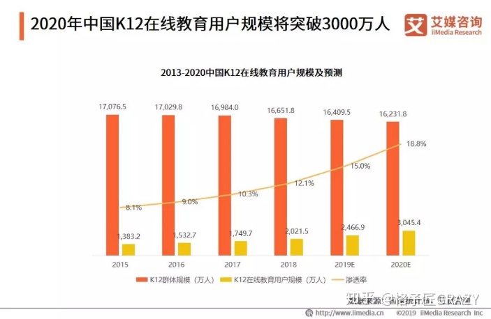 根据艾媒数据,2019 年中国 K12 在线教育市场渗透率为 15%,预计 2020 年将达到 25.8%。