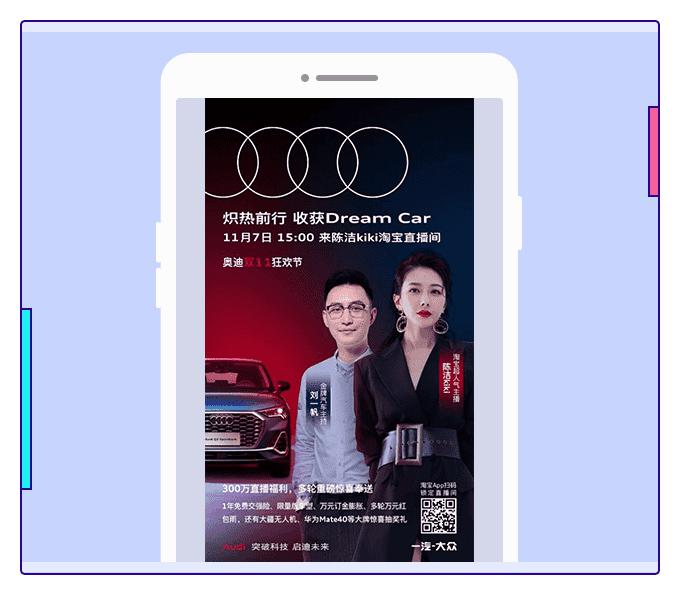 官方直播间+头部淘宝主播直播间+奥迪品牌直播专场的直播内容矩阵与消费者建立互动也是本次合作的亮点之一。尤其在11月7日的品牌直播专场当天,由淘宝超人气主播陈洁KIKI、金牌汽车主持刘一帆共同组成的奥迪逐梦团,带领用户开启了奥迪品牌的Dreamcar逐梦之旅。
