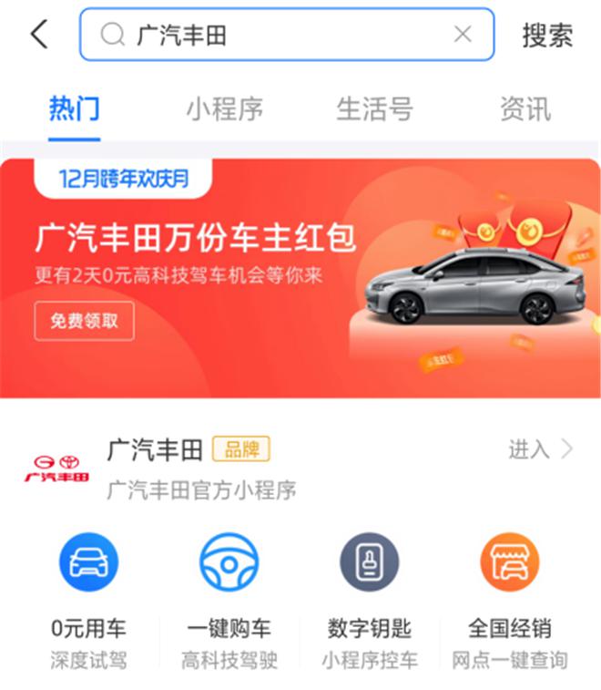 除了上述的圈定用户、培育用户,通过支付宝平台,广汽丰田还在体验环节进行优化提升。活动现场,用户只需打开支付宝扫描二维码或直接搜索“广汽丰田”,关注广汽丰田支付宝小程序,即可了解广汽丰田旗下各款新能源车型。此外,用户还可通过“0元用车”,选定取车城市、取车日期、还车日期,预约深度试驾活动。