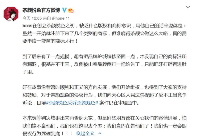 茶颜悦色最后表态,“我们真的在告他们了!我们也一定会跟侵权行为死磕到底!!!”