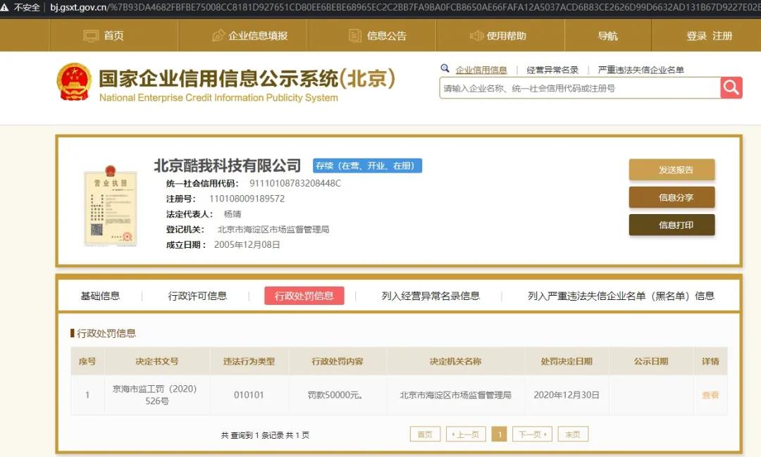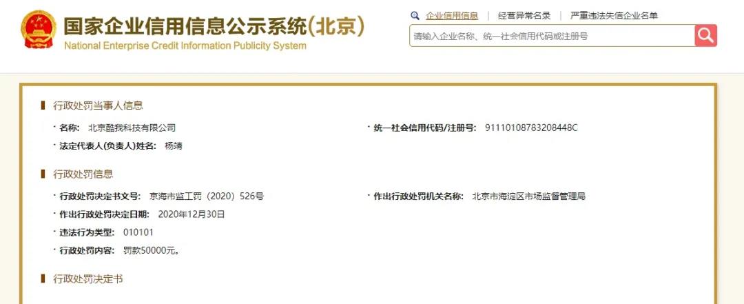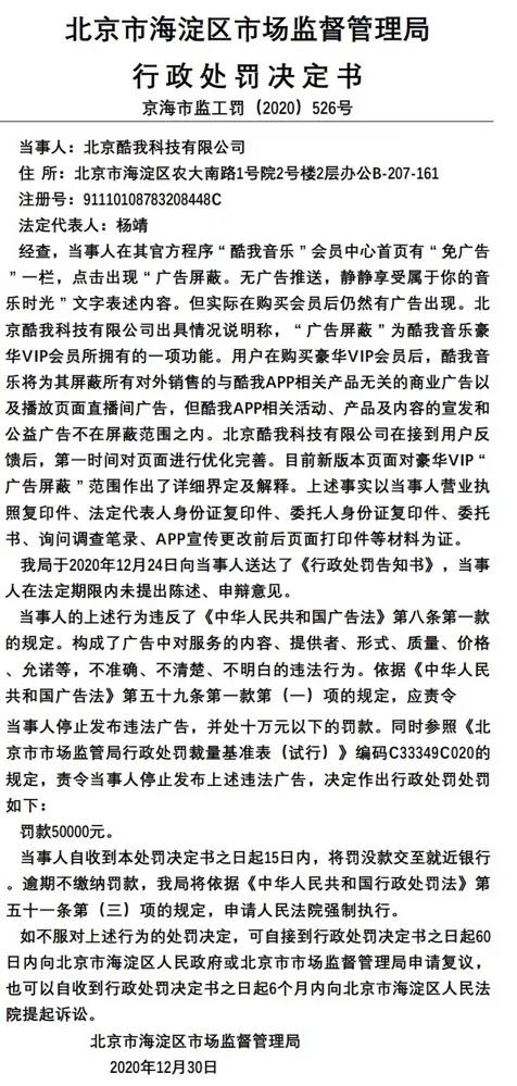今日根据新华网的报道,北京市海淀区市场监管局在在 2020 年 12 月 30 日就北京酷我科技有限公司 “用户购买 VIP 会员后仍收到广告的情况,与页面宣传文字‘广告屏蔽’不符”下达了一则行政处罚决定书,按照法规罚款 5 万元。
