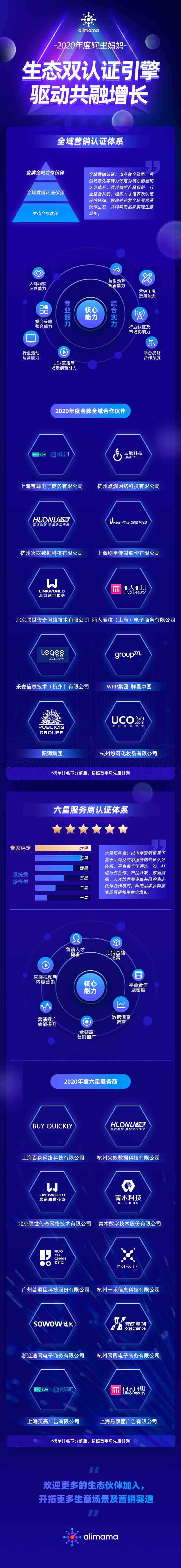 共融增长一直是阿里妈妈生态建设的方向,2020年,阿里妈妈通过金牌全域合作伙伴和六星服务商的选拔,评选出在综合营销实力、业务规模、市场影响力及创新赛道等都有突破性增长的顶尖代理商及服务商。