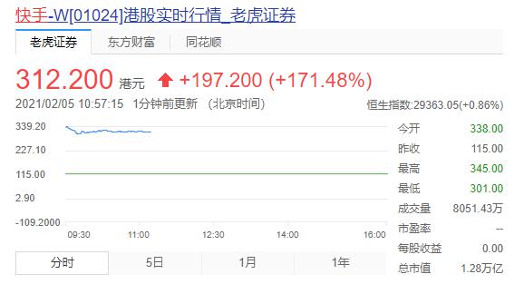 上市首日,快手以338港元高开193%,市值秒破万亿港元,股价一度冲上345港元,较发行价115港元大涨200%。