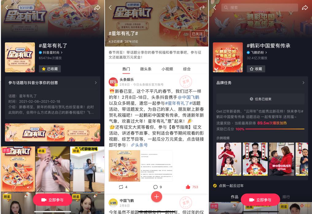 春节前夕,飞鹤奶粉总冠名巨量引擎“星年有礼了”线上主题活动,2021年2月8日-2021年2月18日,头条抖音双端话题#星年有礼了 上线,联动飞鹤奶粉品牌挑战赛#鹤彩中国爱有传承 ,集结20+明星进行话题打call和好物种草,引发了一次用户有玩头、明星有声量、飞鹤有温度的新春礼遇狂欢。