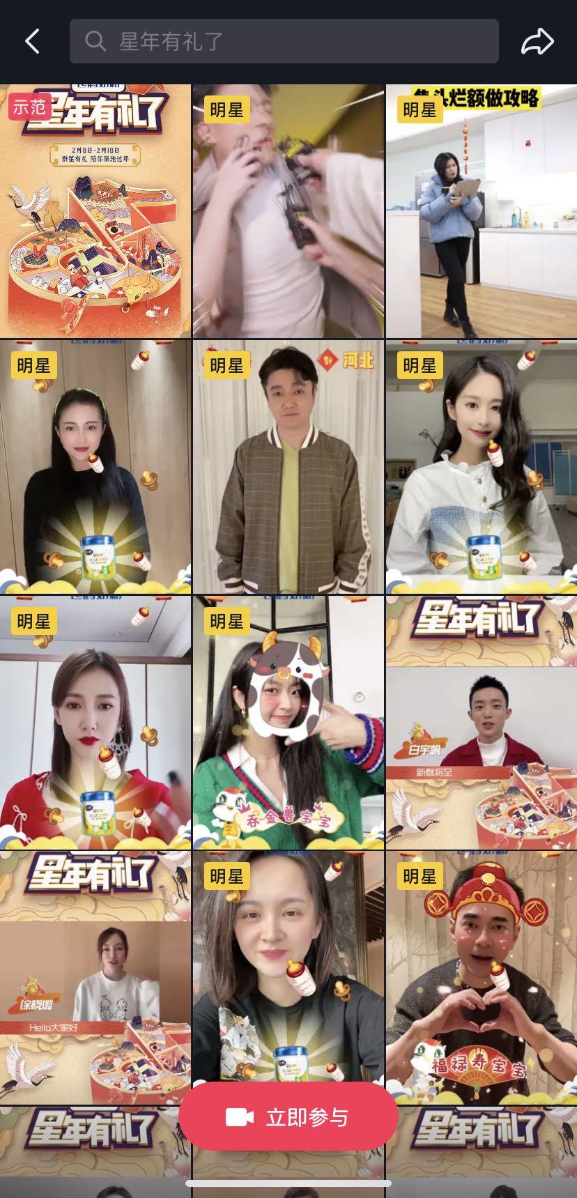 今年,春节场景虽从线下迁到云上,但不变的是年俗年味。飞鹤奶粉注意到抖音用户的“新春三需”,即囤年货的种草需求、送祝福的互动需求、刷视频的娱乐需求,深度参与#星年有礼了 话题活动,同时发起品牌挑战赛,聚焦春节送福送礼场景,话题一经上线,即吸引众多用户前来创作拜年视频。