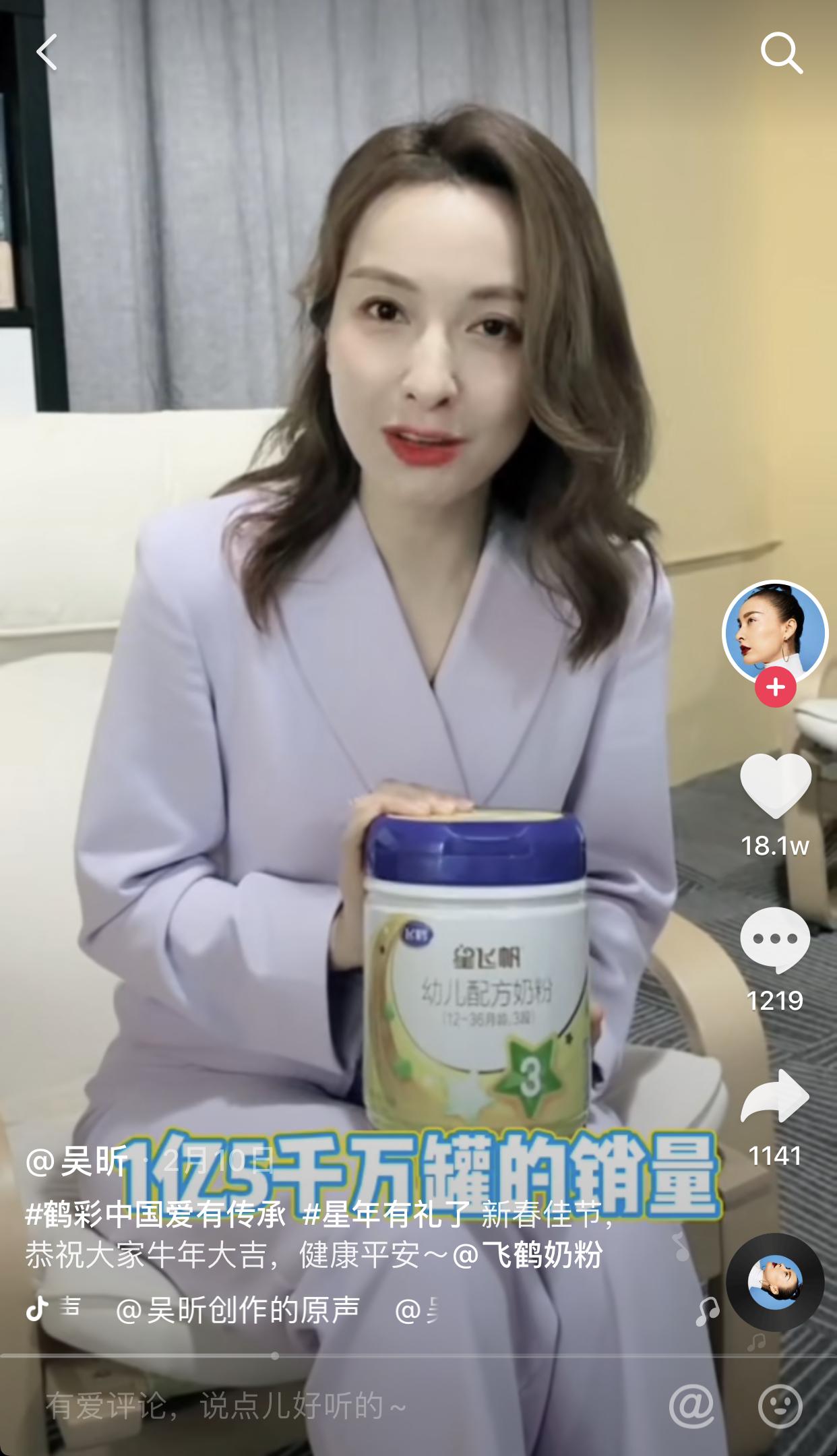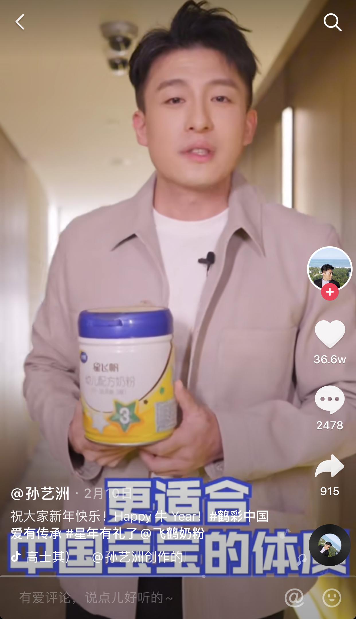 在@孙艺洲 的短视频作品中,飞鹤超高端奶粉星飞帆化身晋级超级奶爸的“神器”,吸引36.6万+抖友点赞;@吴昕 则在短视频中畅谈购物攻略,使得“春节送礼只选飞鹤”的洗脑语录深入人心。凭借这一波明星定制内容,飞鹤奶粉“更适合中国宝宝体质”等优势特点得到强化,成为大批宝爸、宝妈用户的囤货首选。