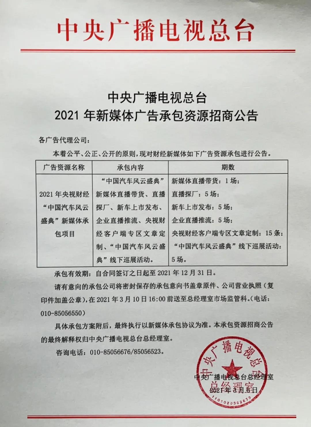 中央广播电视总台2021年新媒体广告承包资源招商公告如下: