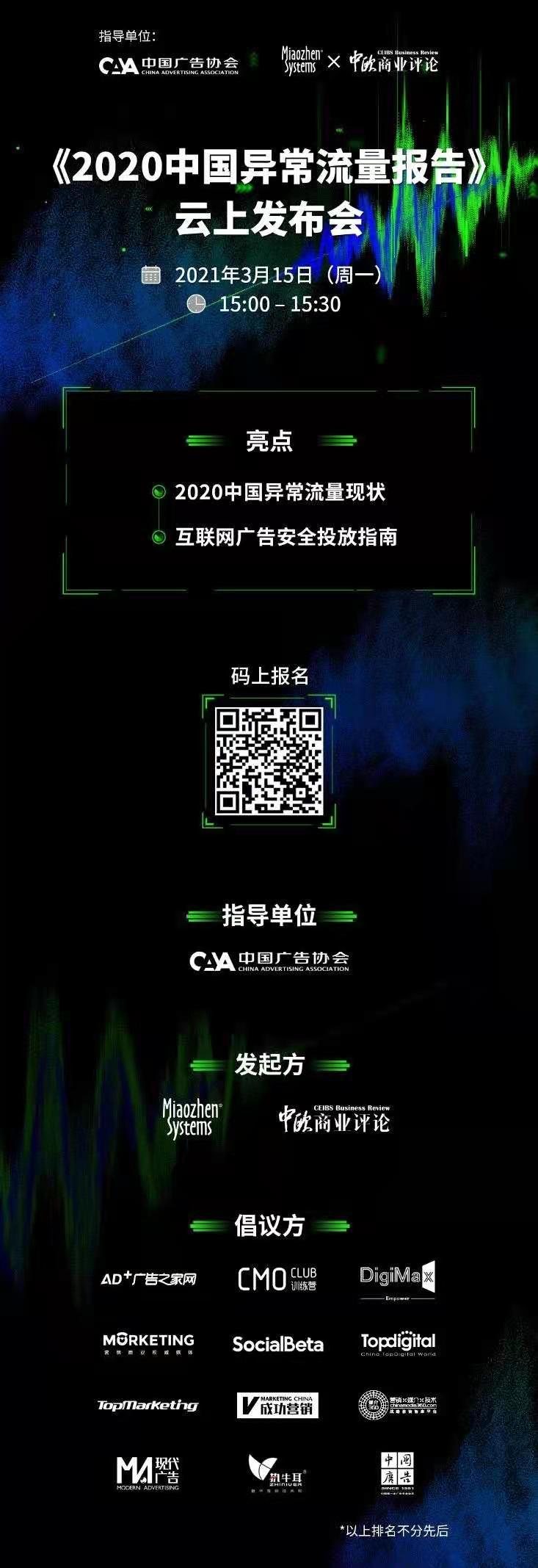 告别粗放式增长,行业标准的落地是推动营销生态健康发展的重要动力。2020年12月,《移动互联网广告标识技术规范》(T/CAAAD003—2020)和《中国互联网广告投放监测及验证要求》(T/CAAAD002—2020)发布。这两项团体标准正是在中国广告协会的推动下,广告主、媒体平台、第三方监测公司等行业各方共同努力的成果。数据真实安全、流量交易透明、行业标准完善,将有利于维护生态的健康。这离不开身处其中的生态各方的努力,携手维护生态透明健康、共促行业长远繁荣发展。3·15当天,秒针系统及《中欧商业评论》将联合举办线上发布会,共同发布《2020中国异常流量报告》。这也是秒针系统连续第7年发布《中国异常流量报告》,希望以此阐明中国数字营销行业异常流量现状,帮助生态各方识别异常流量,并为广告主进行互联网广告安全投放、提升投放ROI提供参考依据。