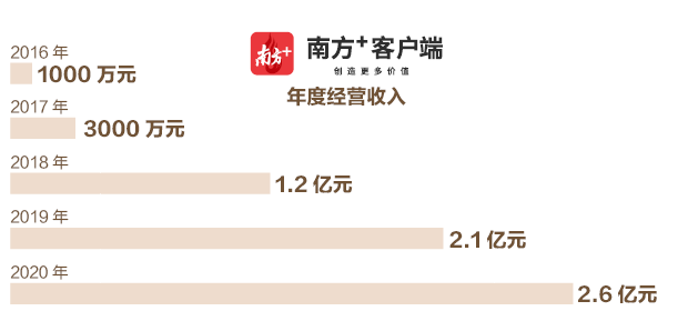在南方日报传统广告营收不降反增、连续多年维持高位运行、2020年广告收入3.27亿元的基础上,南方+的营业收入从2016年的1000万元快速增长到2020年的超过2.6亿元。