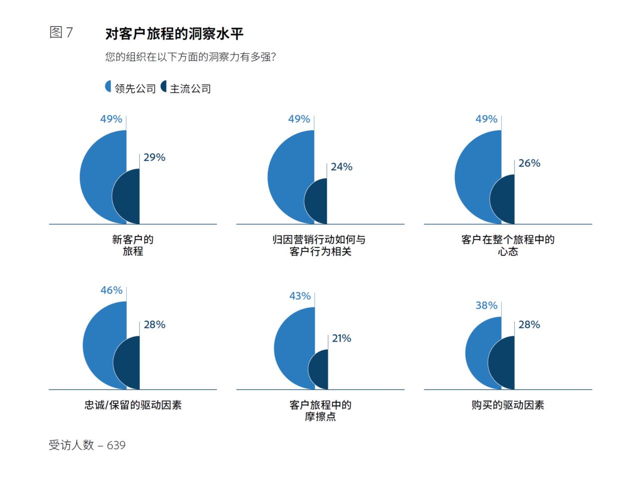 调研表明,越是领先的绩优的企业就越具备较高的数字化素质,越能更好地理解客户旅程。他们在新客户旅程、客户行为归因、客户心态、客户忠诚度、旅程摩擦点、购买驱动因素等方面的理解都普遍优于一般的公司。这些绩优企业在客户洞察的速度、准确性和可操作性等方面也都普遍好于普通公司。