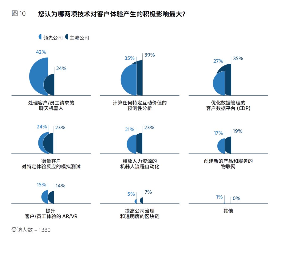 数字化素质较高的绩优公司几乎都已经做好了充分准备,迎接新的营销技术所带来的用户体验革新机会。其中被最广泛采用的一个例子(42%)是使用聊天机器人来处理客户或者是员工的请求。这种投资少,见效快且符合品牌特点的方式目前深得许多公司的青睐。