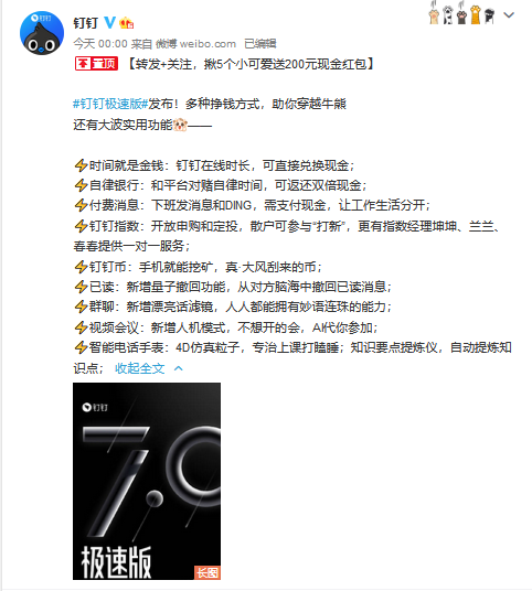 接下来便是钉钉,新版上线,更新了诸多功能,但居然都跟钱有关。