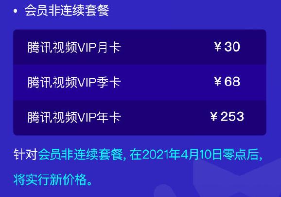 针对会员非连续套餐,调整为VIP月卡30元,VIP季卡68元,VIP年卡253元,腾讯视频方面称,针对会员非连续套餐,在2021年4月10日零点后,将实行新价格。