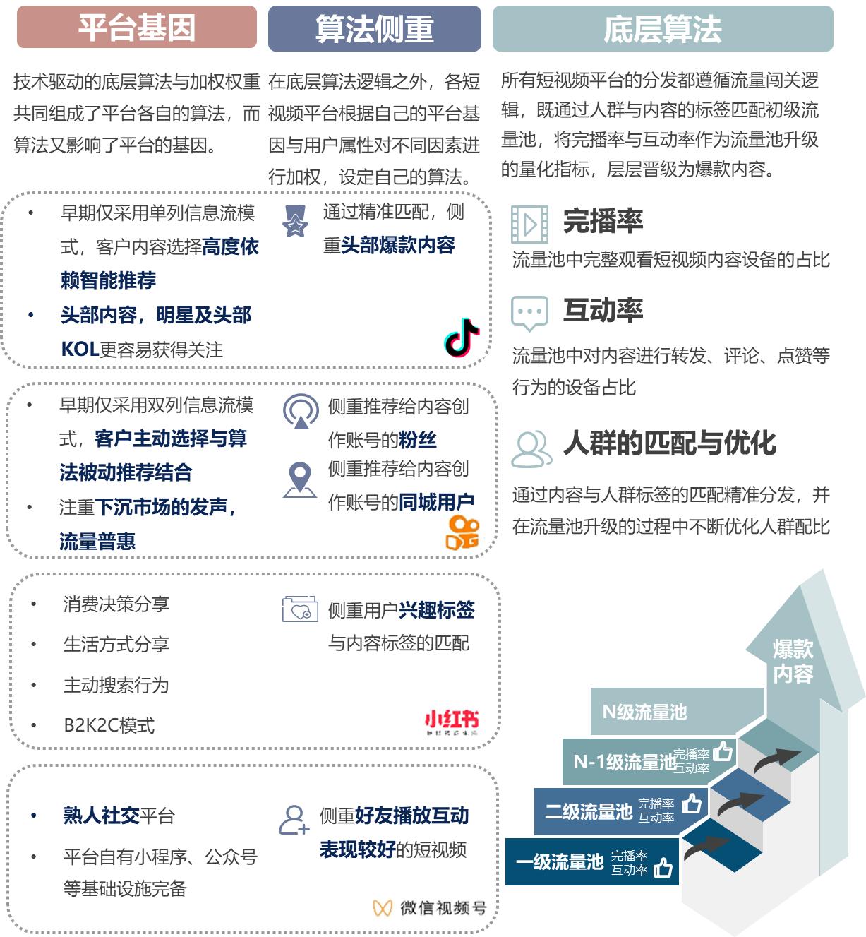 • 从流量来看,短视频平台普遍采用公域流量入口+算法推荐+定向人群曝光+中台数据赋能的模式。入口上,微信视频号在公域入口的基础上,基于微信原有生态设立多个私域场景流量入口,作为流量承载和分发中心。抖音、快手和小红书更倾向于通过公域获得流量。