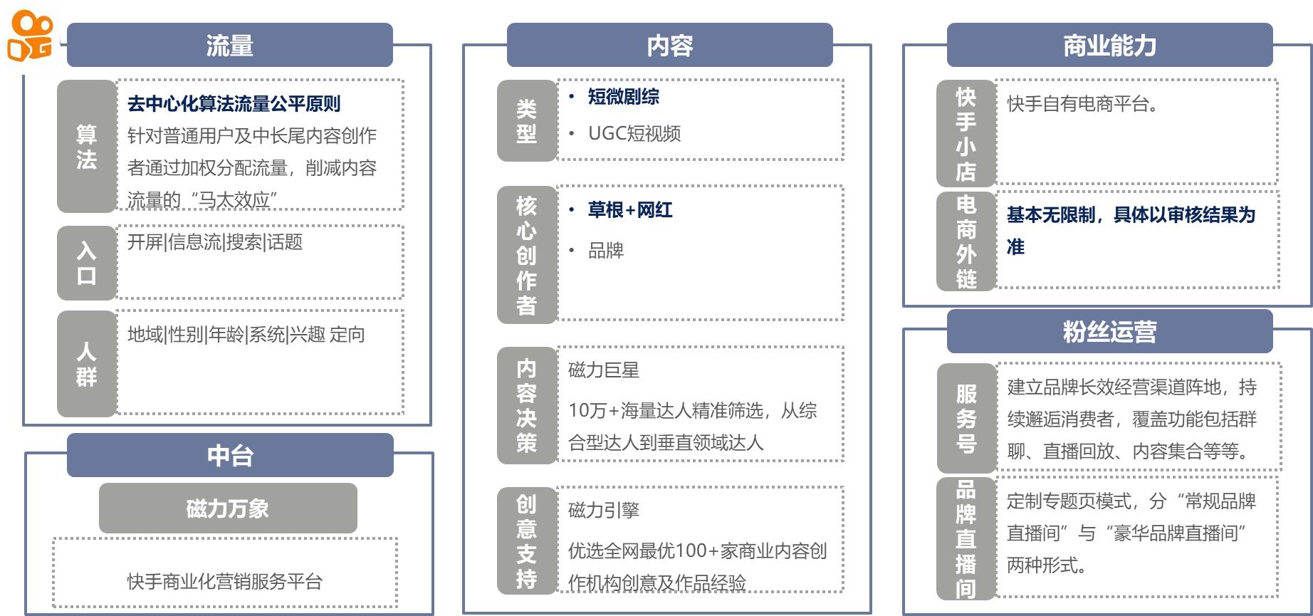• 从商业能力来看,小红书电商起家,有明显的“商城”入口。抖音已独立电商,上线支付功能,不再外链电商平台,已开始部署本地O2O变现能力。快手依赖用户的信任,借草根主播发展直播电商。视频号借助“微信-小程序”在转化环节另辟蹊径,将“转化渠道”与“私域场景”相结合,有效弥补了平台在转化上的软肋。