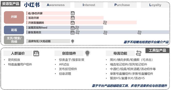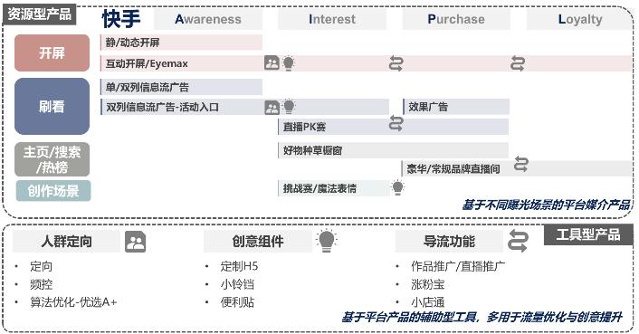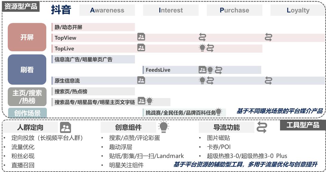 在平台媒介产品方面,群邑智库根据产品功能分为资源型和工具型产品。在资源型产品中结合消费者的使用场景分为开屏、刷看、搜索和创作四大场景;在工具型产品中根据产品的特点分为人群定向、创意组件和导流三大功能。